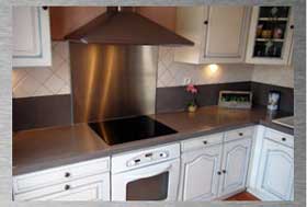 Küchenrückwand nach Maß mit Falz zur Fugenabdeckung oder Falz nach vorne 90° Küchenrückwand aus Edelstahl mit einer Dicke von 8 bis 20 mm, mit oder ohne Holz-Unterlage und optionaler Verschweißung an den Winkeln / Arbeitsplatte aus Edelstahl, 22 bis 40 mm. Einzelheiten zu Dicken und Oberflächen